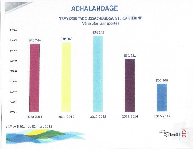 Les informations obtenues de la STQ sont très limitées et la variation de la présentation des rapports annuels de La Société d’une année à l’autre ne permet pas d’établir les coûts totaux de la traverse de Tadoussac. (K64 à K70)