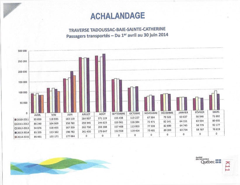 - La STQ est satisfaite d’un taux de satisfaction élevé lors de son sondage annuel sur la satisfaction de sa clientèle. Cependant ce sondage est fait en juillet ou août, au moment où 4 passagers sur 5 sont des visiteurs ou des touristes (280,000 passagers en août 2014 alors que les passagers assidus et réguliers sont 59,000 en février) Ce faisant, la STQ transmet annuellement à l’Assemblée Nationale des résultats complaisants quant au taux de satisfaction des usagers habituels. (K11)