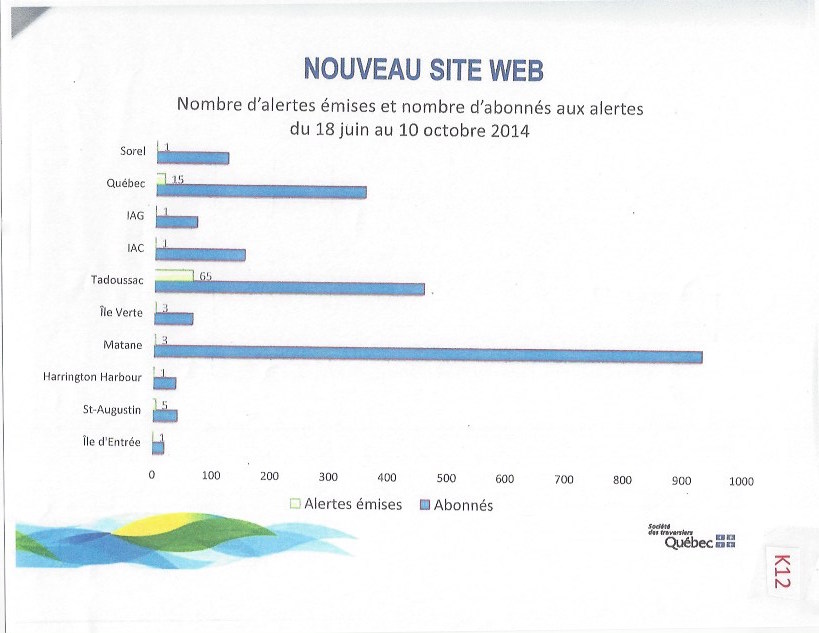 - Le nombre d’alerte émise à l’été de 2014 indique un taux d’alerte 4 fois plus élevé (65) que sur la deuxième traverse ayant le plus d’alertes : Québec-Lévis (15) (K12).